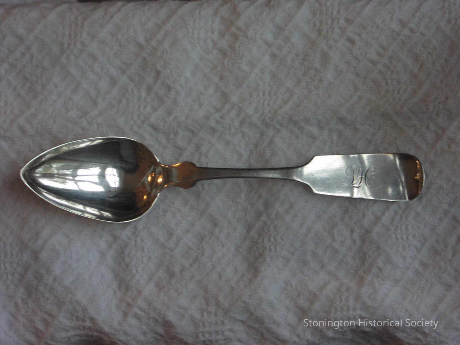 Coin plate silver spoon with initials "L.H." on the handle. Very simple design.
