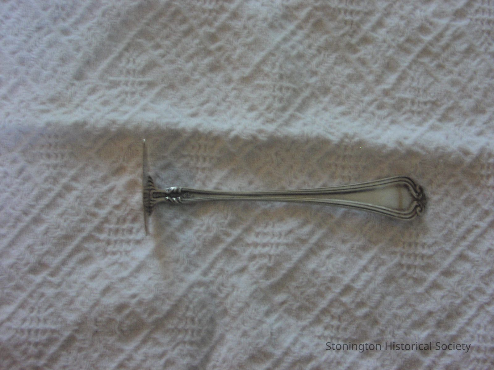 Silver baby food pusher. Used to push food onto a fork.