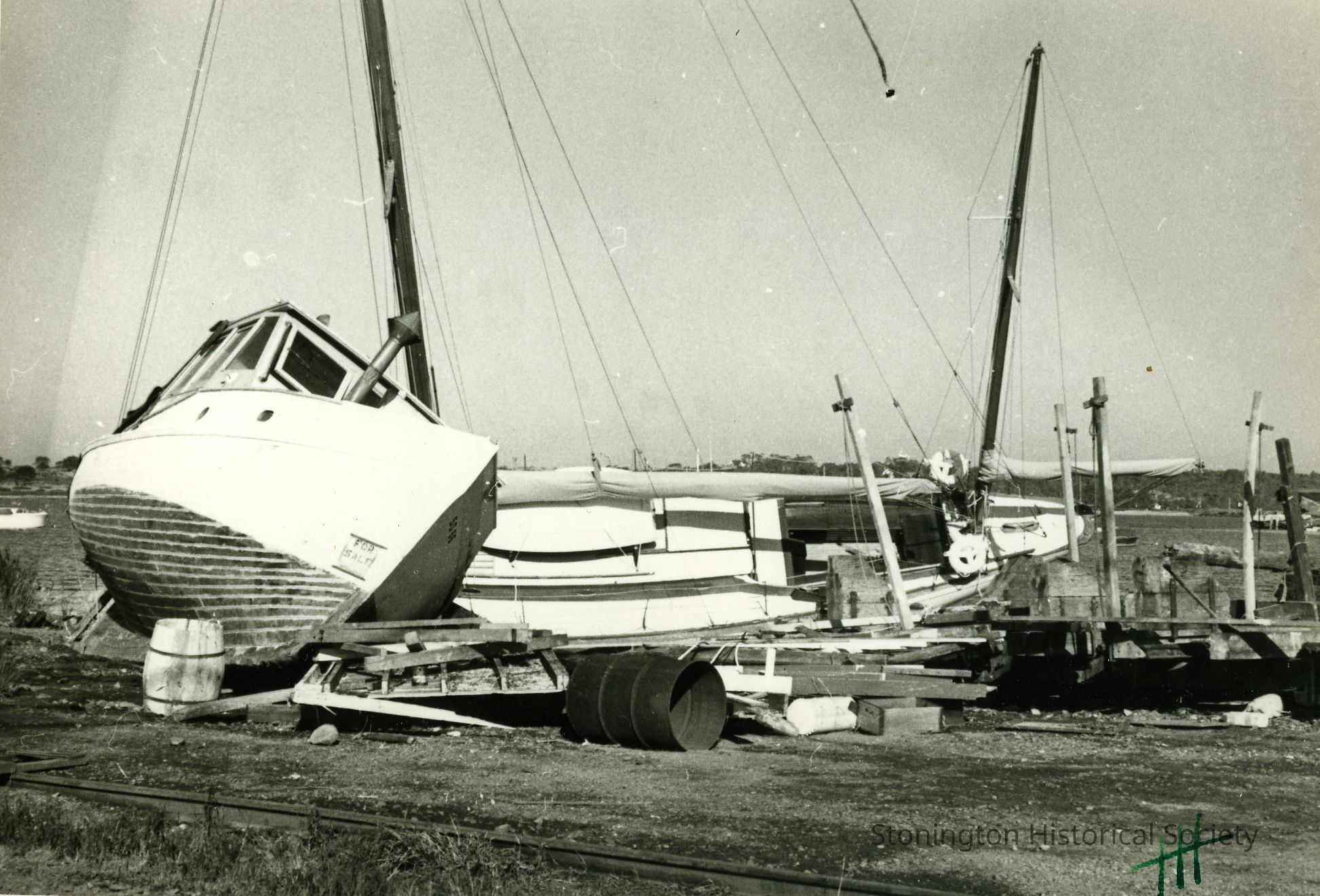 Boats washed up on Town Dock, one with "For Sale" sign, track in foreground