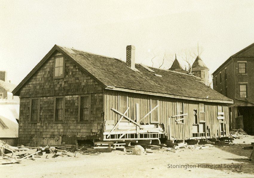 Damaged house/building shored up with wooden slats to block entry. Merrill House is in background with brick building on right