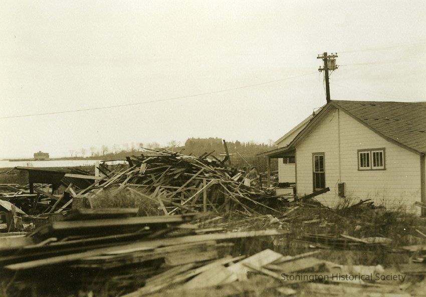 Damaged houses with lots of debris; large houses in distance