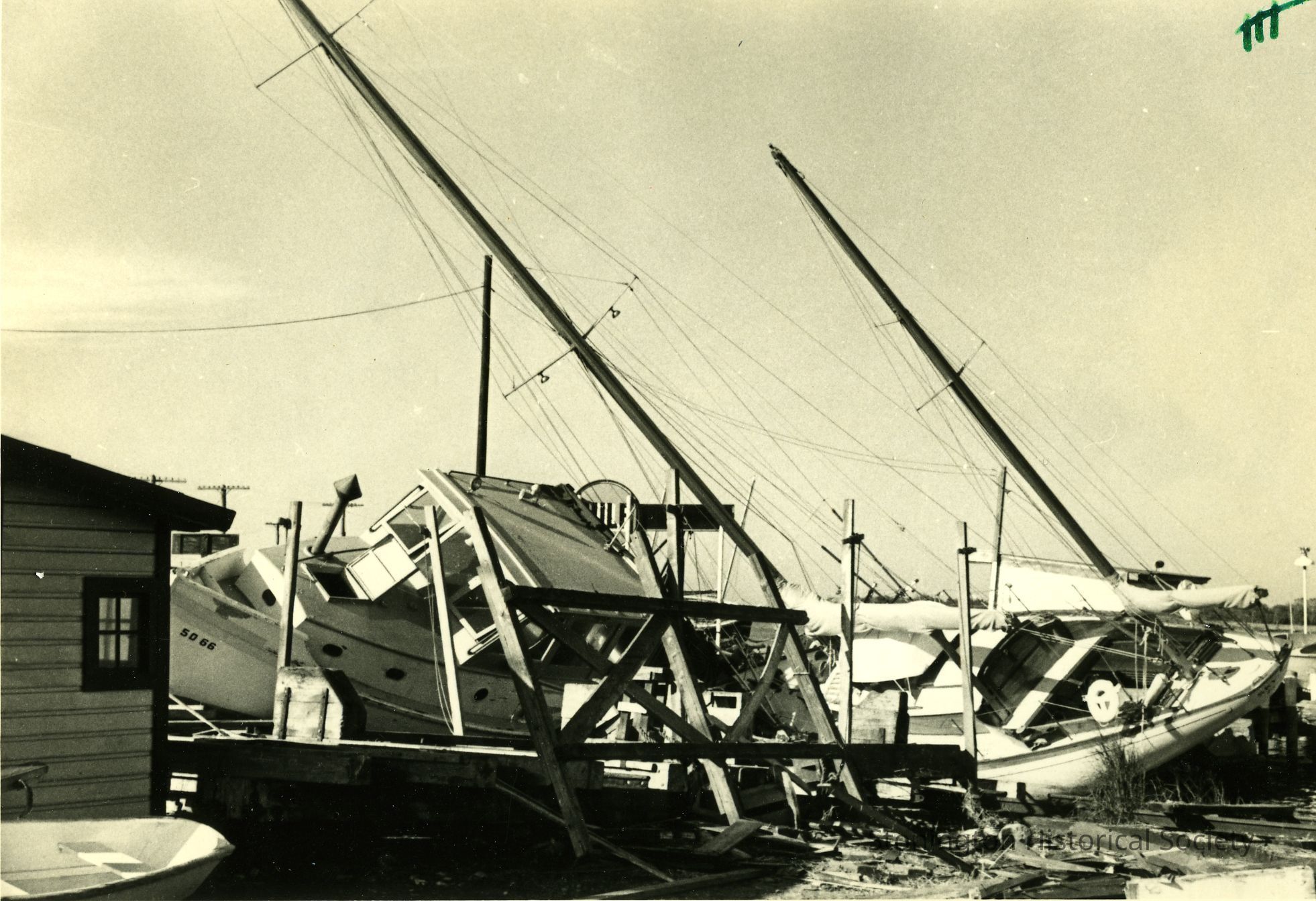 Boats washed on shore at docks with Gulf sign in background and small building on left