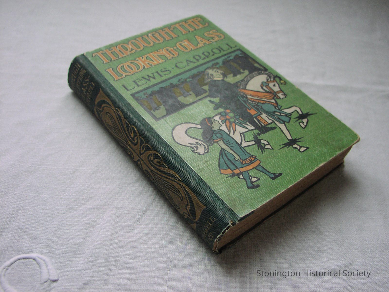 "Through the Looking Glass" by Lewis Carroll, published by Thomas Y. Cromwell & Co. Publishers, New York, 1893. Green illustrated book cover with orange and lack lettering, dark green spine with gold lettering.