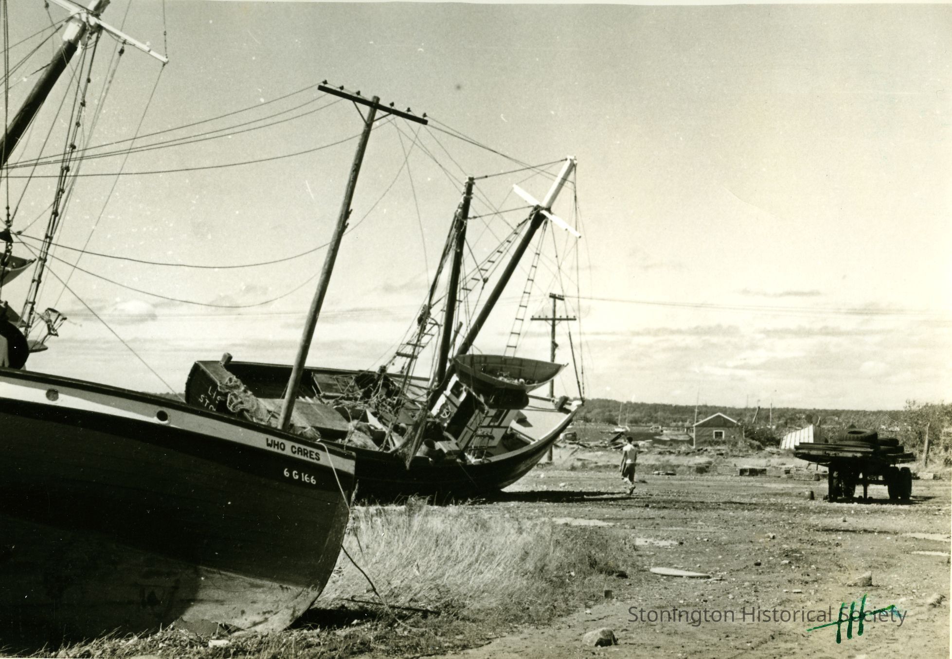 Fishing boats washed on shore, boat in foreground named WHO CARES. Wagon with tires on right side of photo