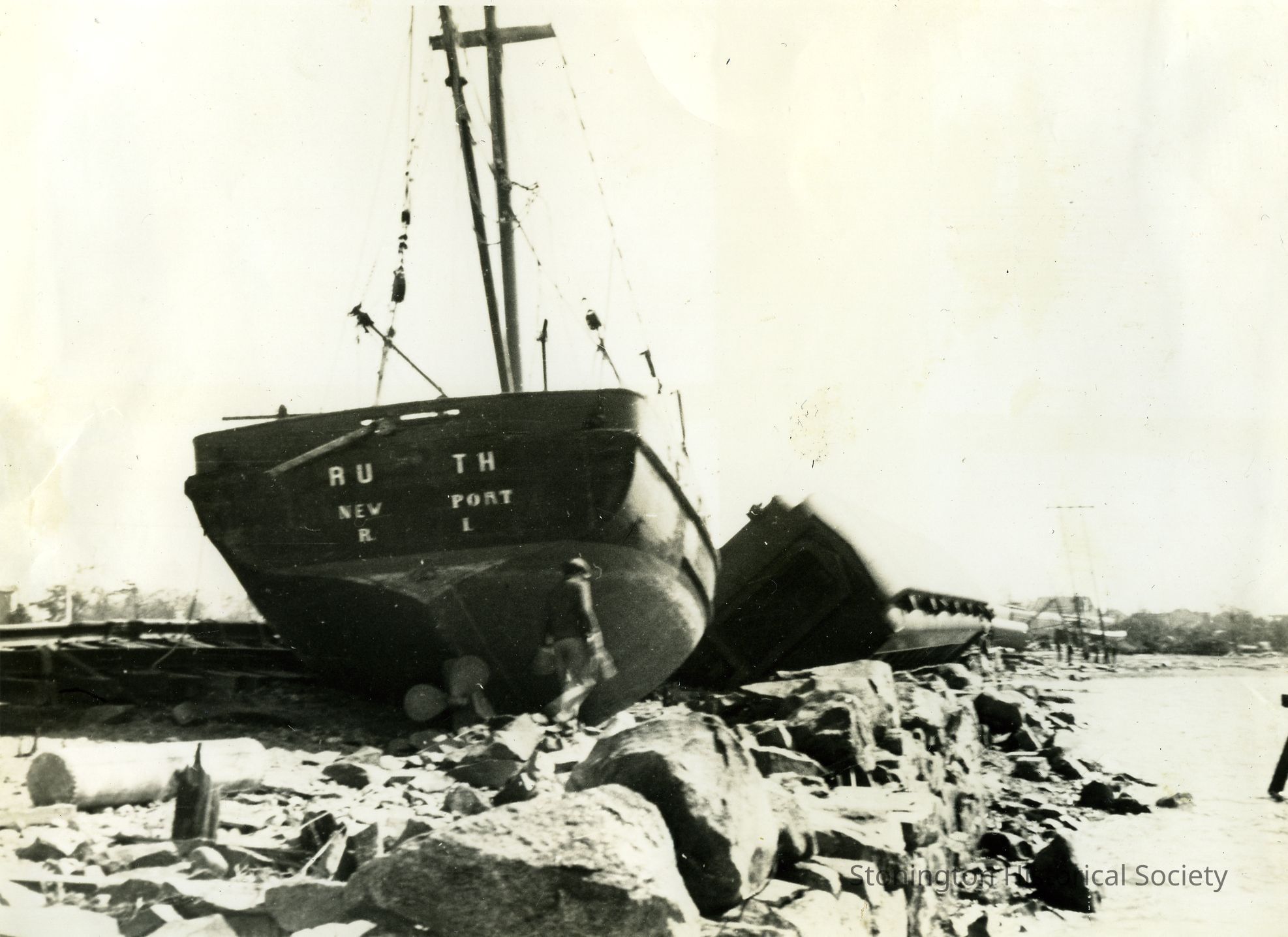 Fishing boat RUTH from Newport RI with derailed train on causeway