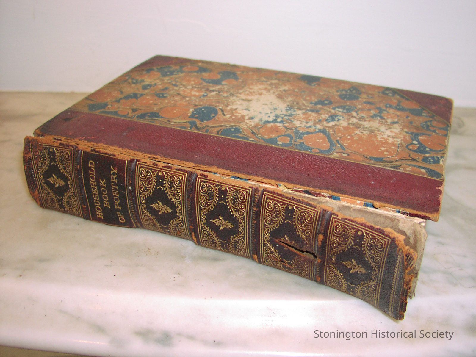 "The Household Book of Poetry" collected by Charles A. Dana, published by D. Appleton & Co., New York, 1875. Pink and blue marbled book cover, red spine with gold lettering & embellishments.