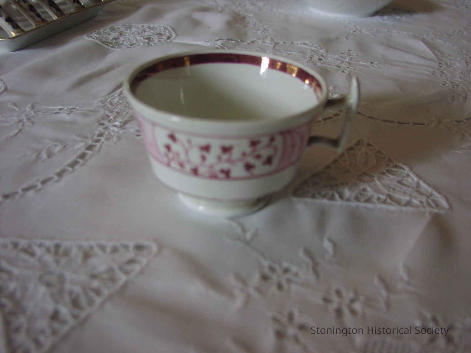 Pink lusterware teacup with a pink band. The band contains a design of pink vines. A band of pink lines the inside rim.