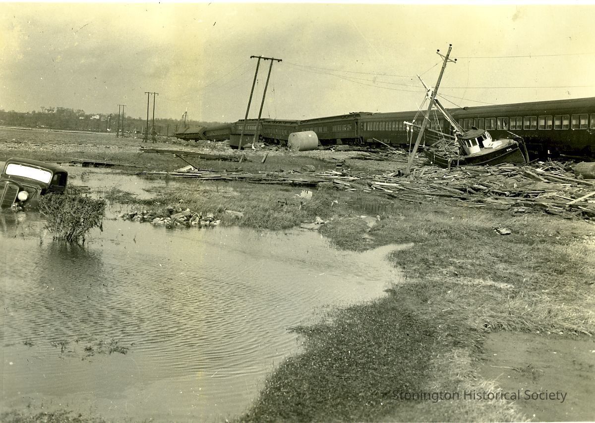 Derailed train from New York to Boston on causeway with fishing boat and car; north end of Stonington Harbor