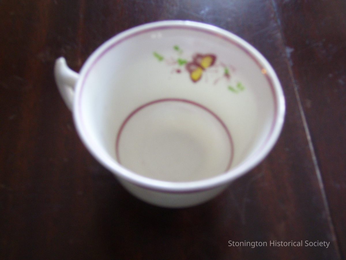 Pink lusterware teacup. The outside has a large pink stripe at the rim. The insid is painted with a bee and a butterfly.