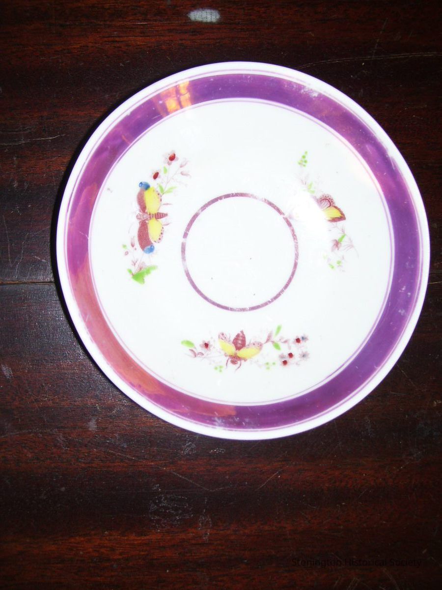 Pink lusterware saucer witha thick pink stripe at the edge and a fly, moth and butterly painted inside.