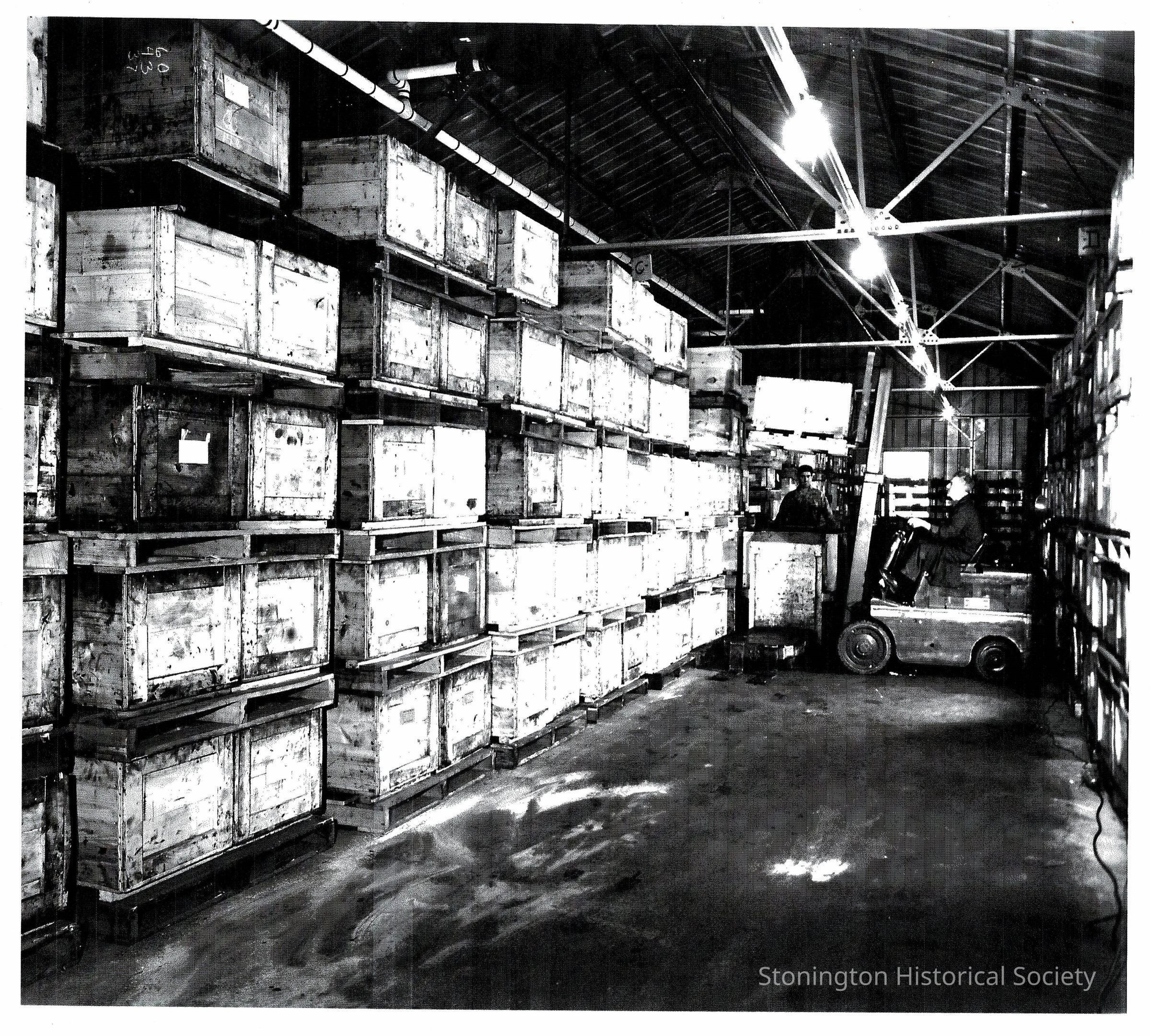 Interior photograph of Atwood Machine Company in the 1940s. A worker is operating a forklift placing wooden crates onto pallets.Collection