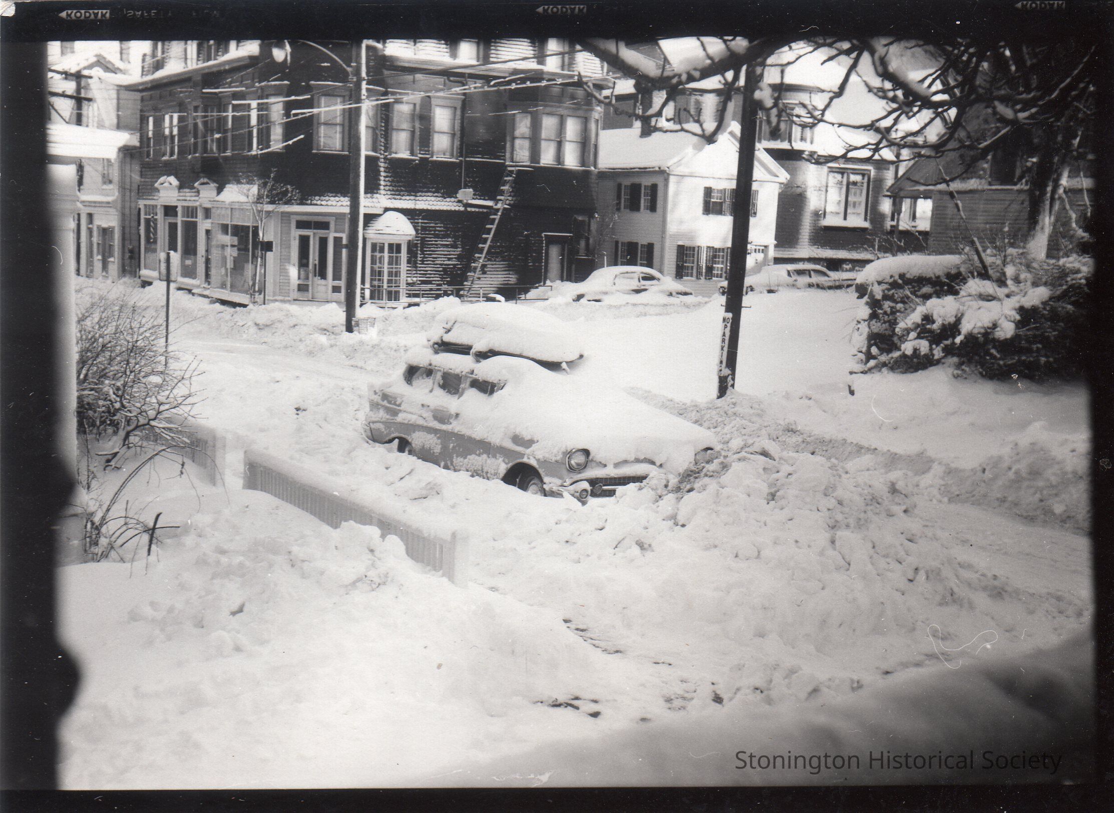 Black and white snapshot, snowstorm in Stonington, corner of Water Street and Union Street, 1960s. Photographed by Al (?) Fraser.