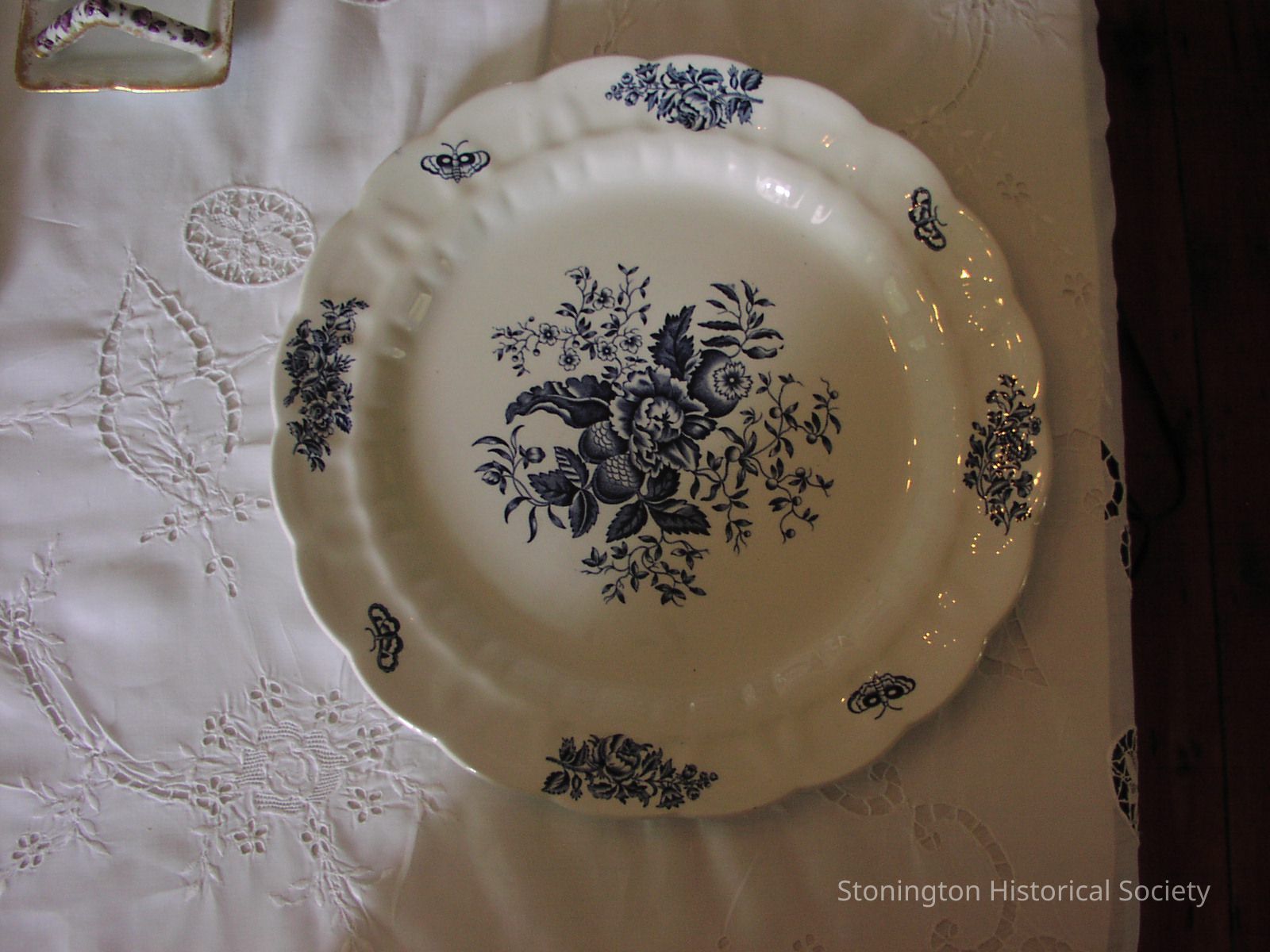 Round serving platter with blue transferware design of a large flower, a berry and two acorns surrounded by smaller flowers, berries and leaves. The outer portion of the dish has alternating flowers and moths. The bottom is marked "Booths made in England peony A 8021." In green two numbers are marked: 292 and 23.Collection