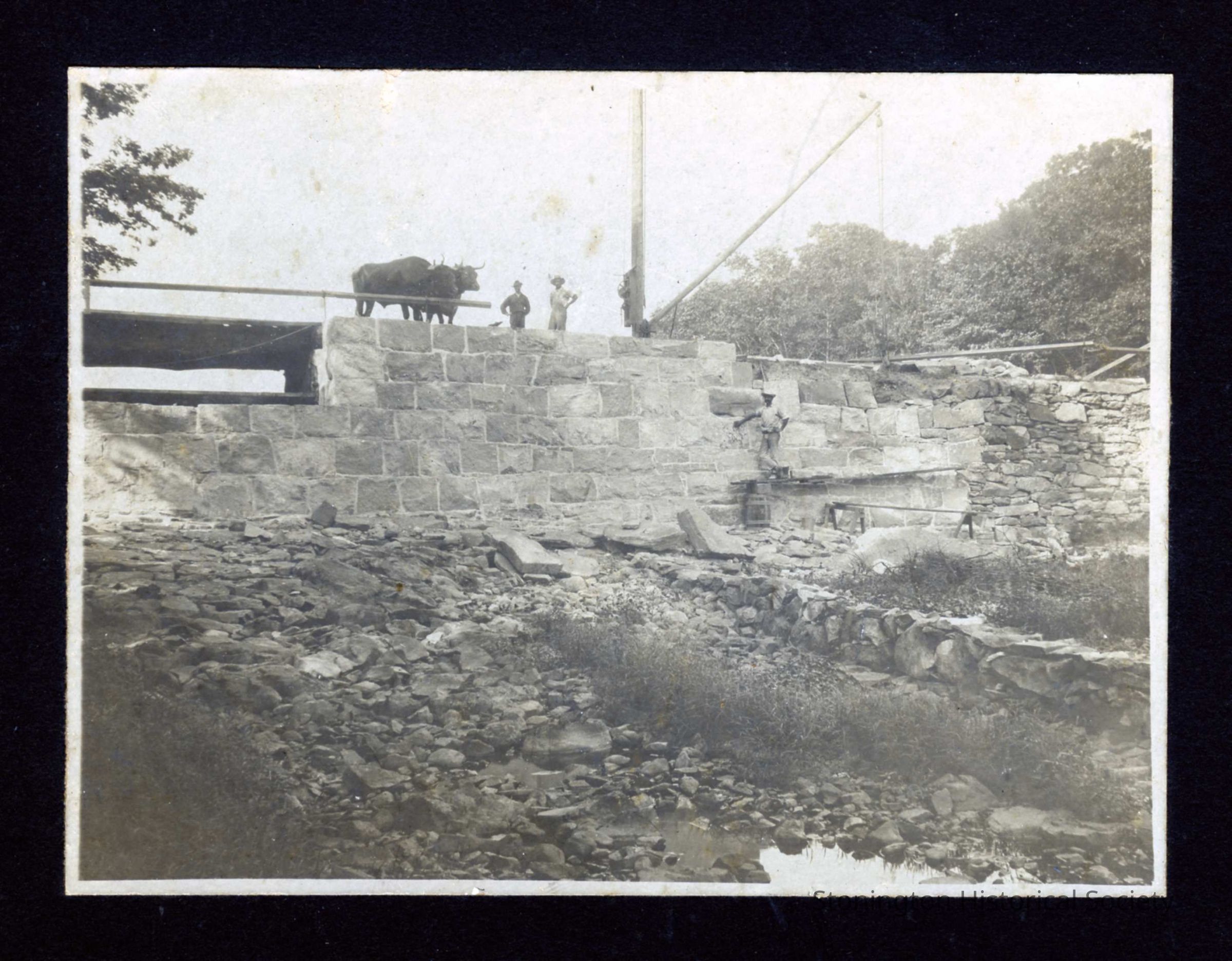 A small black and white photograph pasted to a black cardboard backing. The image shows the dam at Dean's Mill being built. Reverse side reads: This is a picture of the building of the upper dam at the Dean's Mill Water Works, that supplies water to Stonington and Mystic. This was probably about 1890. The people in the picture are Mr. Asa Wilcox in the lower part of the dam; Mr. Calvin Wilcox, brother of Asa in the upper part near the hoist, and next to him was their cousin Fred Wilcox. The oxen belonged to Asa and Calvin who inherited them from their father, Nelson. This picture was given to me September 28, 1950 by Miss Phebe Wilcox, youngest sister of Asa and Calvin.