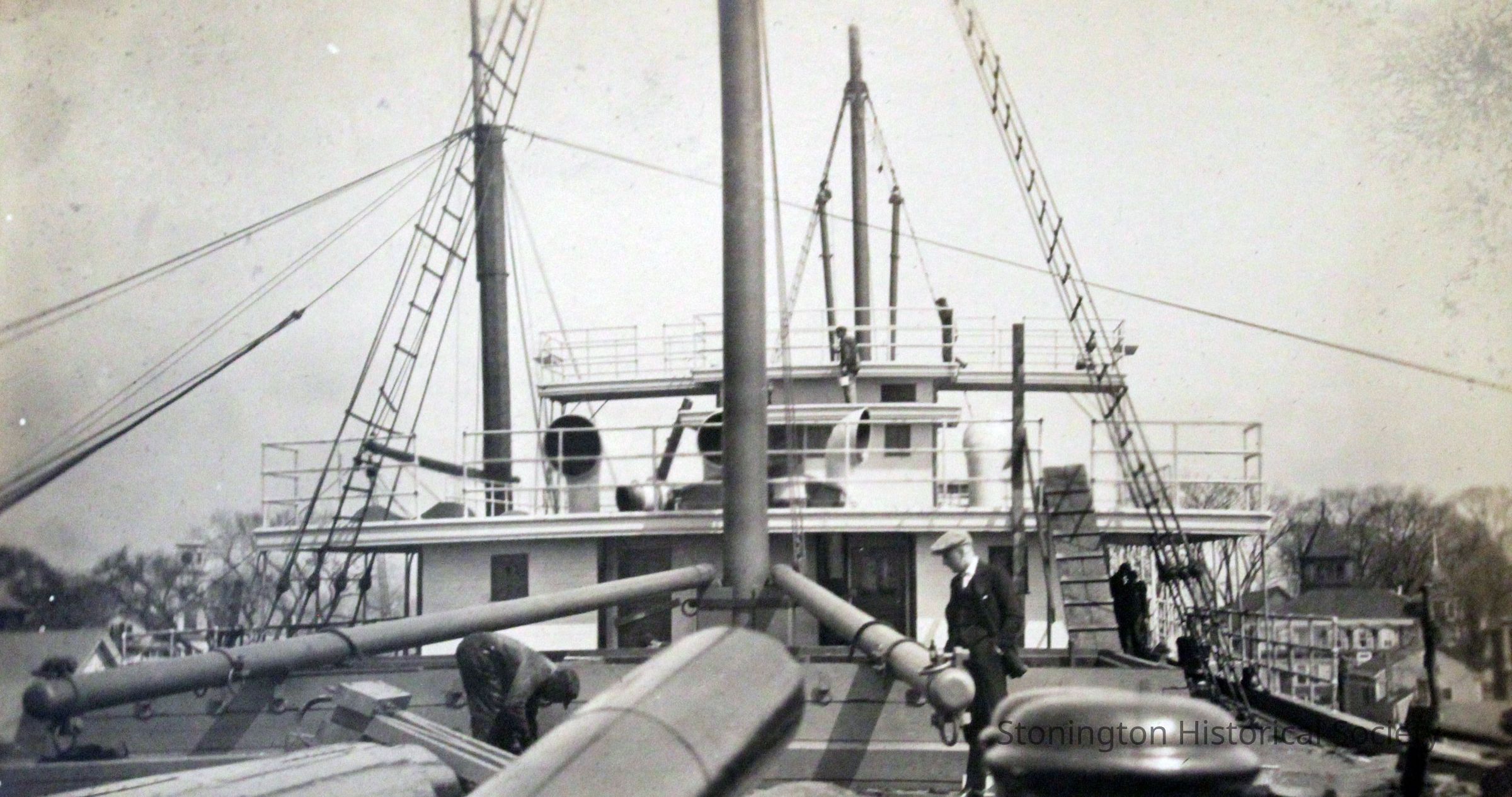 Workers putting the finishing touches on the SS Lansing before its launch in May of 1919. A few extra building materials are still visible on the deck, but the ship appears to be nearing completion. The Lansing steamship was rebuilt by the Ship Construction and Trading Company, Inc. of Stonington for the Nafra Company of New York.Made/Created
