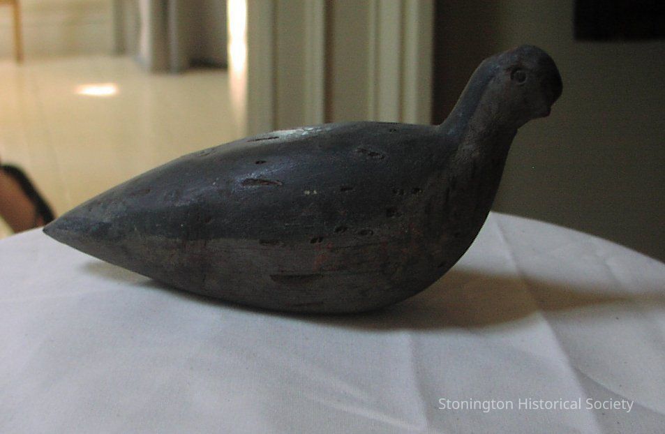 Wooden duck decoy, hand-carved, hand-painted; black and brown with pin holes (powder post beetles?); beak missing; nail heads for eyes.Collection