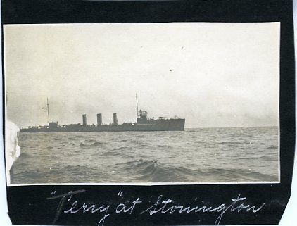 Destroyer TERRY in Stonington harbor, Summer 1914 under the command of Captain A. W. Fitch. Original on black paper is behind the reproduction photo.Collection