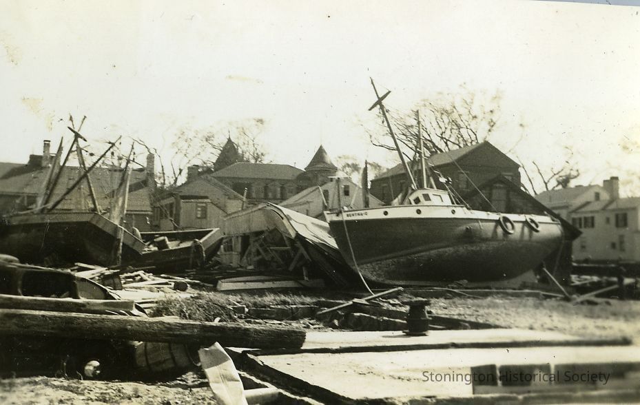 Fishing boats washed ashore near Town Dock with Water Street in background