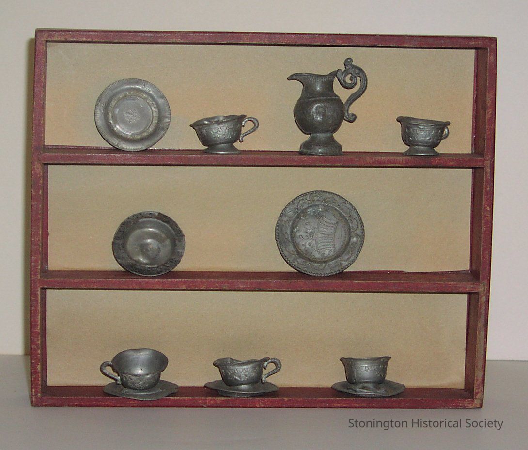 doll's pewter dishes, on shelves, 12 piece set (5 cups, 3 saucers, 1 bowl, 2 dishes, 1 pitcher)