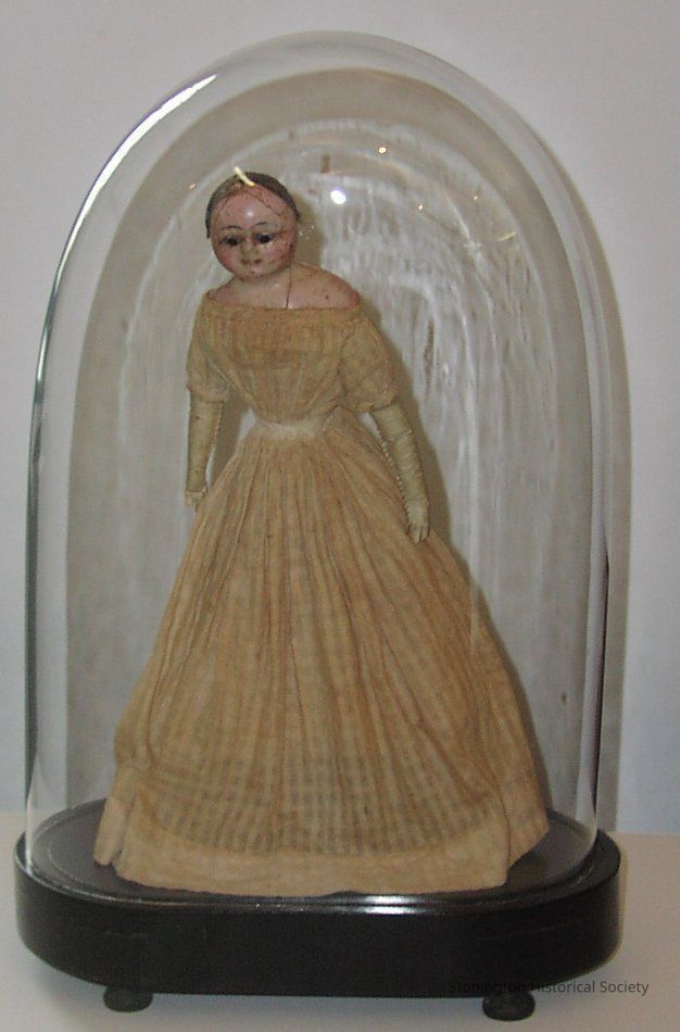 Wax doll with movable eyes, long beige dress, in domed case. Eyes can be opened and closed by pulling a wire attached to the doll's left leg.