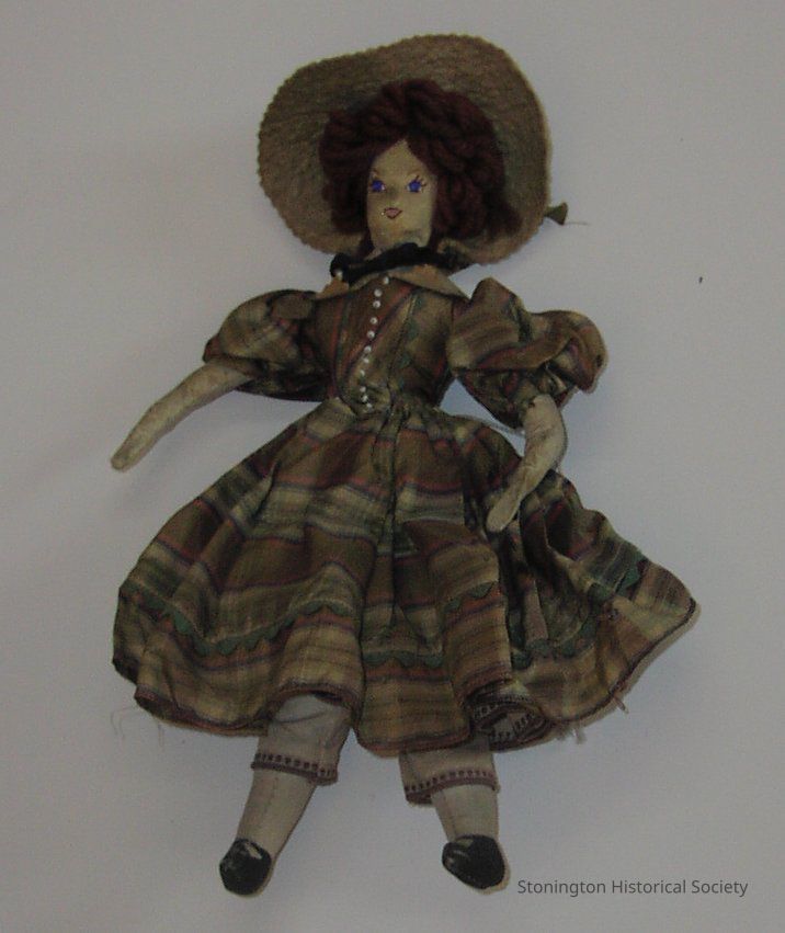 Doll, leather face with painted features, red yarn hair, plaid taffeta dress and white underskirt with purple trim, small line of white beads down bodice and black gibson bow at her neck, felt hat with faded green ribbon, cloth feet with black shoes, leather arms, ca. 1820Collection
