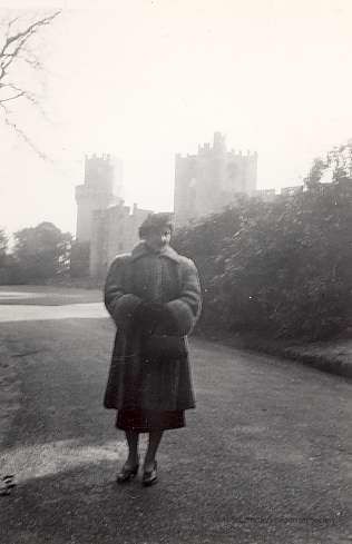 Dorothea in front of Warwick Castle, England. Notes on back of photo. Slightly different view then Item #2002.0613.695