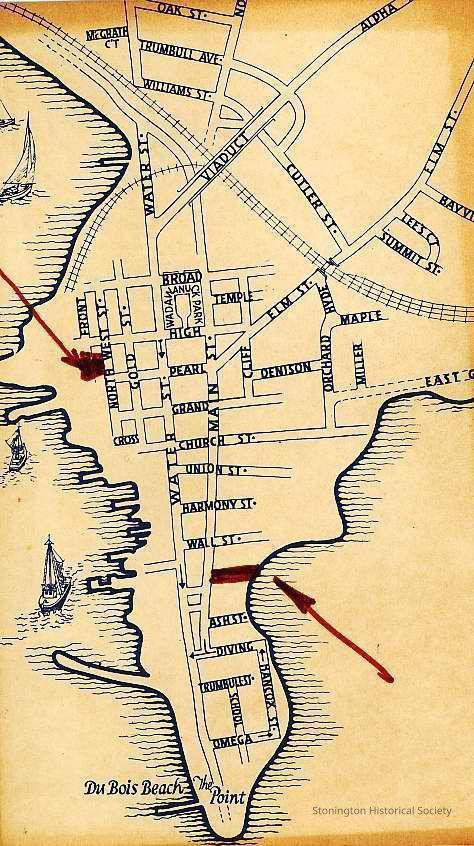 Small flyer for Stonington Borough with map and marks in red showing North West and another unnamed Street. Flier was put out by the Stonington Village Improvement Association. Little bit of information about the borough on back side.