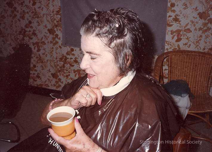 Dorothea Gould at hairdresser getting a perm. "Butterfly before emerging from the moth!" In section marked 1980s