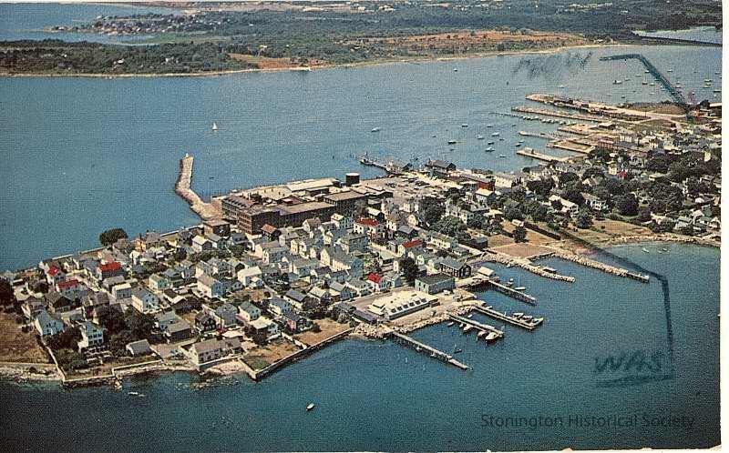Aerial photograph of Stonington borough with notes about founding of the borough on back. On front indications of "was" and "now" possibly refering to where Dorothea lived.