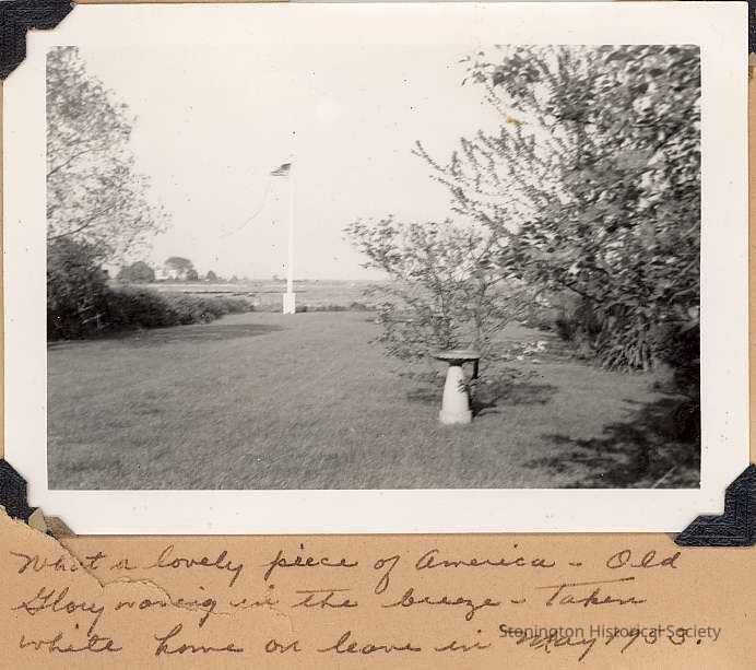 Photo of lawn with flag and sculpture taken May 1953 while on leave from England In section marked 1950s