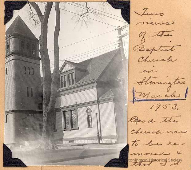 View of Baptist Church in Stonington taken March, 1953. Includes notes about this picture and the next one (Item #2002.0613.686)