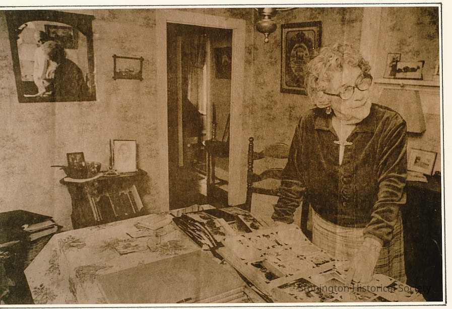Dorothea Hewitt Gould in her dining room showing scrapbooks to somebody seen in mirror.