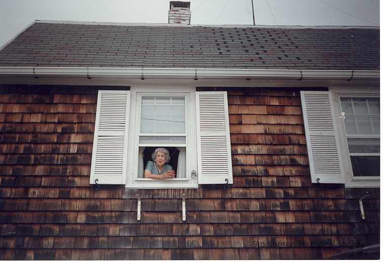Photo of Dorothea watching a rainy Blessing of the Fleet, from her home at 19 Northwest Street, June 1993. Note on back.