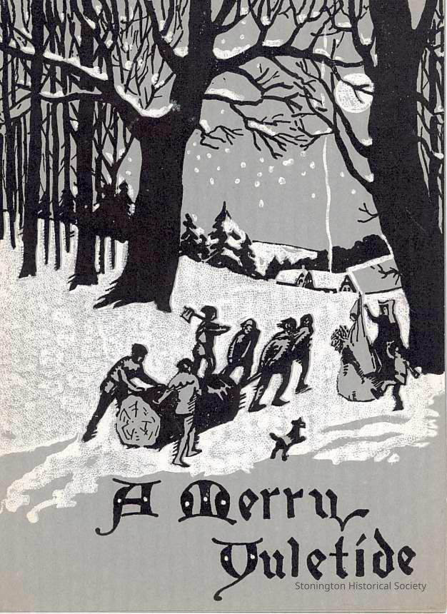 A Merry Yuletide card with men hauling wood in forest. signed Bill B Trumbull.