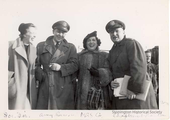 Group of four people with names written on bottom and note on back: "Lenese (?), Maj. Leavitt, Dee Gol and Chaplain Kessler." Dorothea Gould is second from the right.