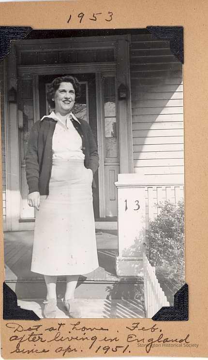 Dorothea on front porch at home (13 Main Street) in February 1953 after living in England since April 1951