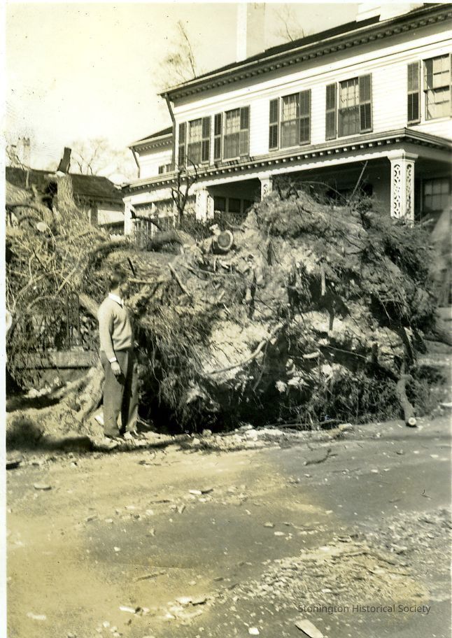 Corner of High and Main Streets with man standing in front of downed trees in front of house