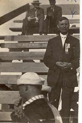 Part of postcard on grandstand with Dr. James H. Weeks named on back at the unveiling of plaque for the Battle of Stonington, 1814.