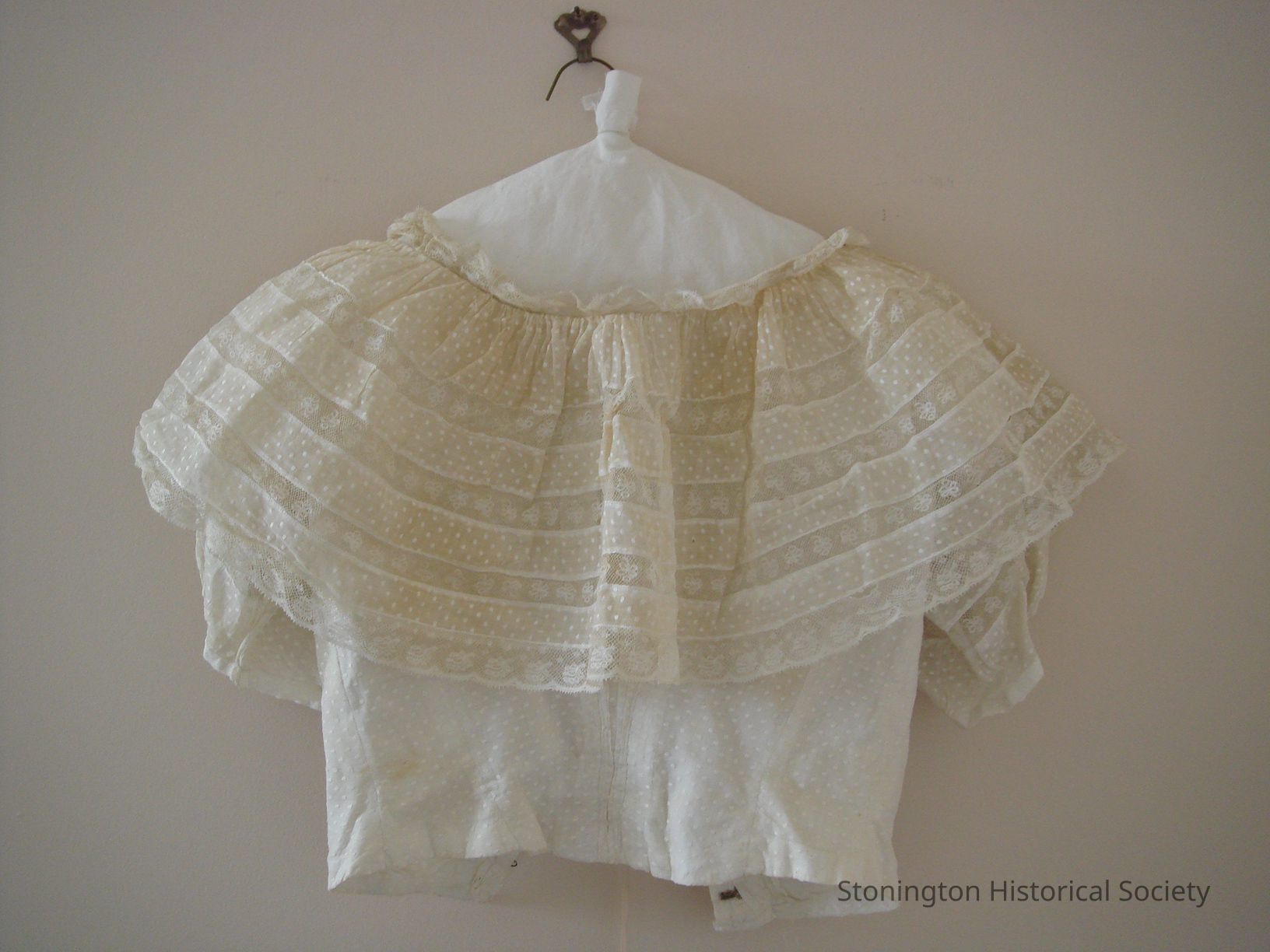 b- skirt- unlined dotted swiss with lace medallions and linear 3/ lace panels forming triangular designs. ruffled hem with lace trim and trainCollection
