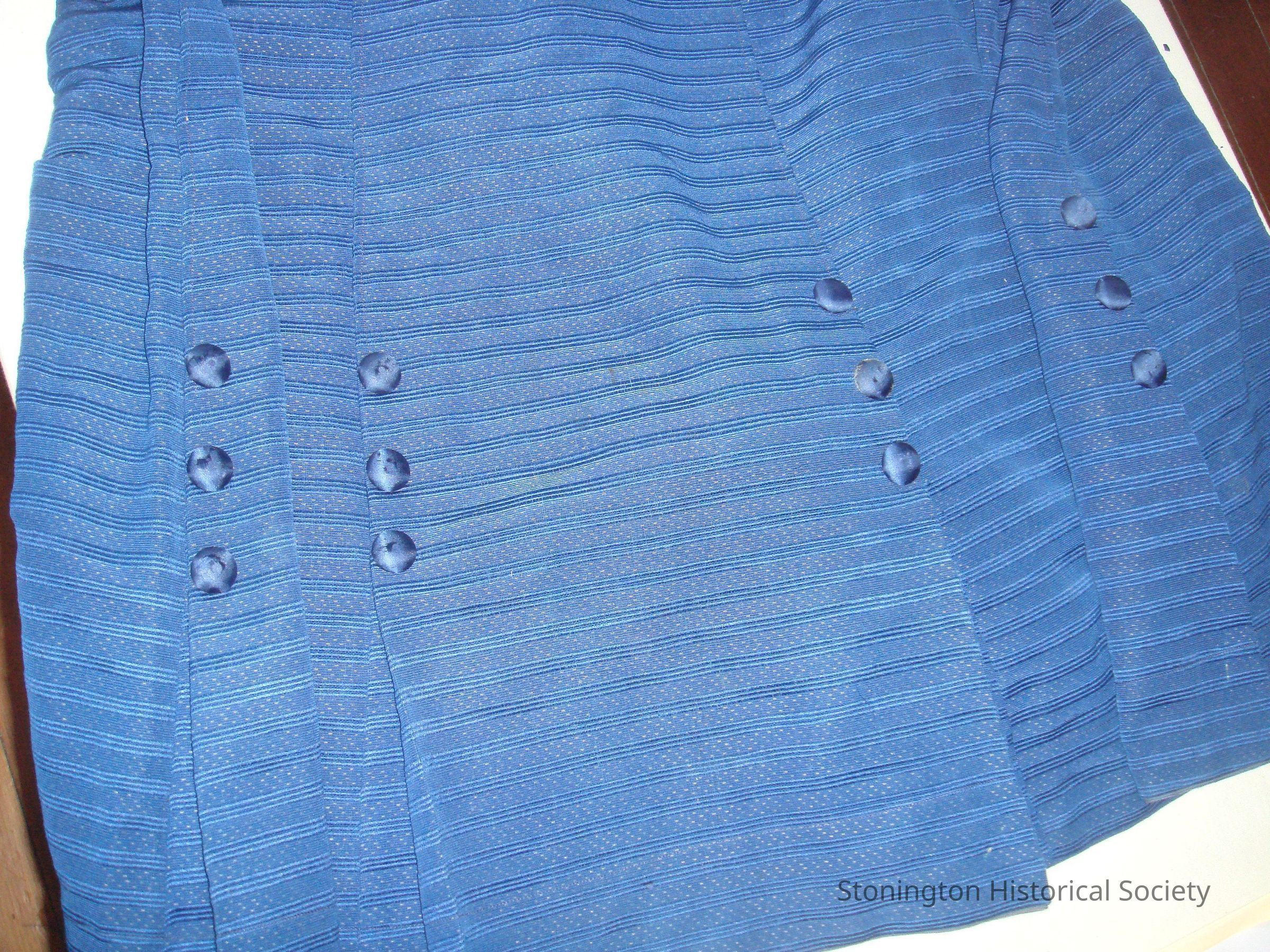 V-neck embellished with hand applied blue lace with 5 bones at high neck, this piece of lace appears to have been removed from another garment and hand applied to dress.Collection