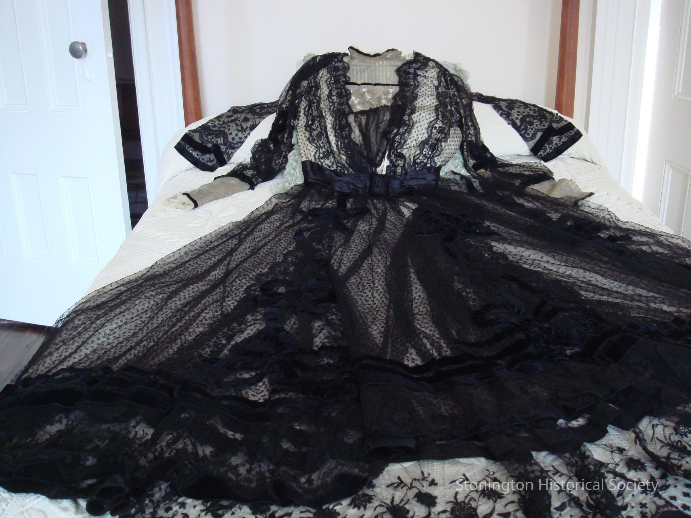 a- bodice- black embroided lace lined in cream silk, full sleeves which narrowat forearm to wrist, 3 button closure at wrist, gold wire and thread mesh fabric at lower sleeve with black velvet trim, black velvet bow on sleeve fullness