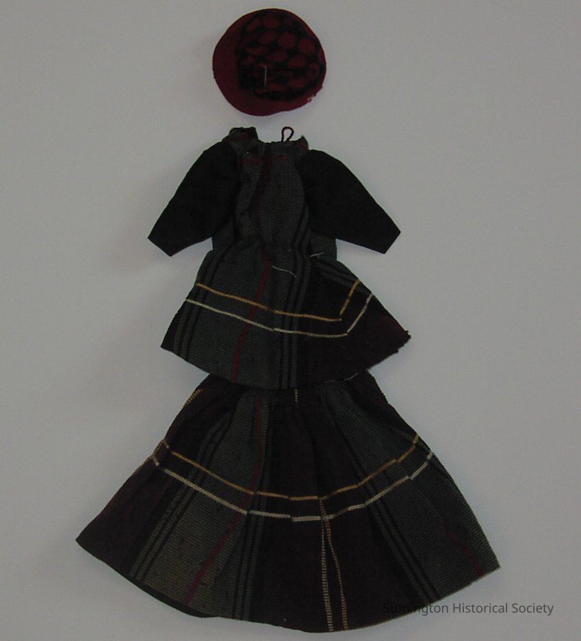 doll's dress, 2 piece green plaid walking costume with a red hat