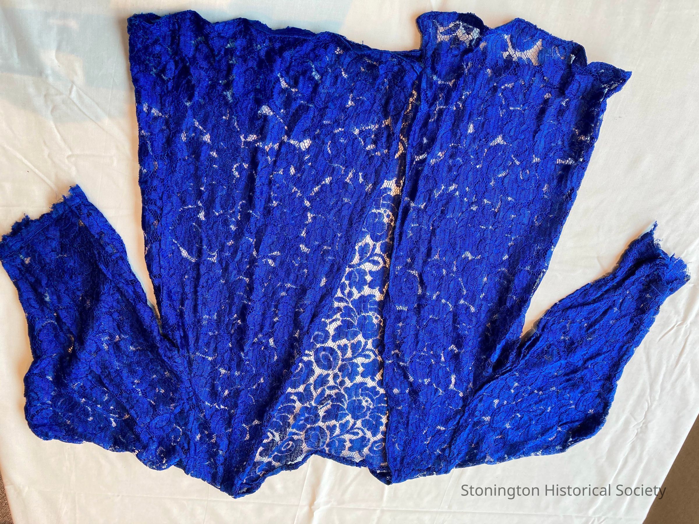 a. Dress machine made lace, sleeveless, unlined, V-Neck front and back. slight rhucing at front bodice midline, evidence of adjustment on shoulder seams