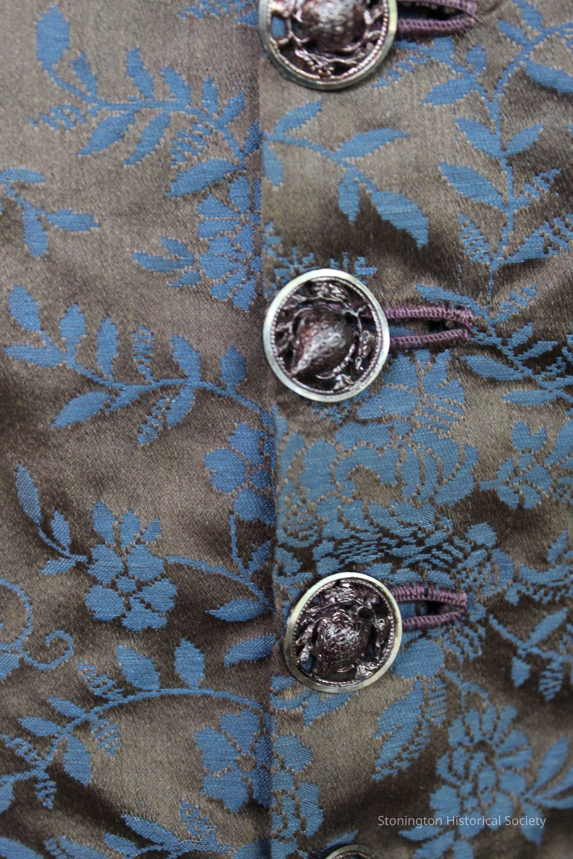 dress of blue and copper silk lampas weave with button down front closure
