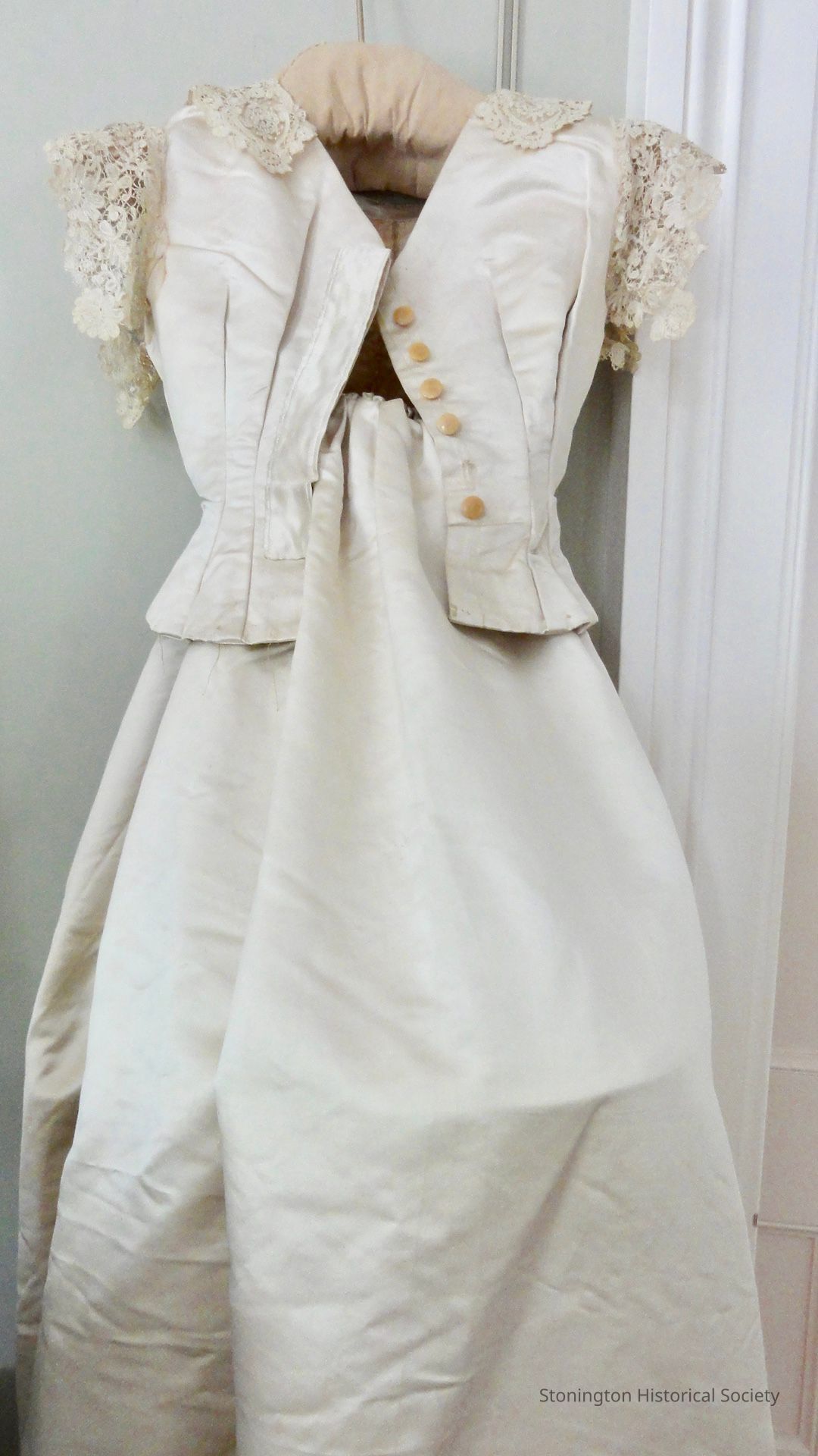 worn by Margaret Loper Rathbone, Grand-daughter of Richard Fanning Loper, on her marriage to George Busse 1885
