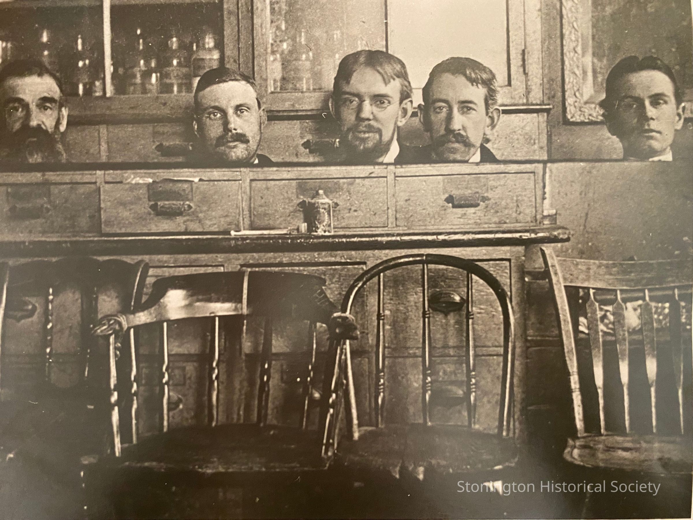 A black and white photograph, undated, from the Tubbs collection. This image shows Dr. Weeks, the town dentist, second from left, and to his right Harry Doty. The image has been manipulated to make it appear as if the men's heads are resting on the counter.Collection