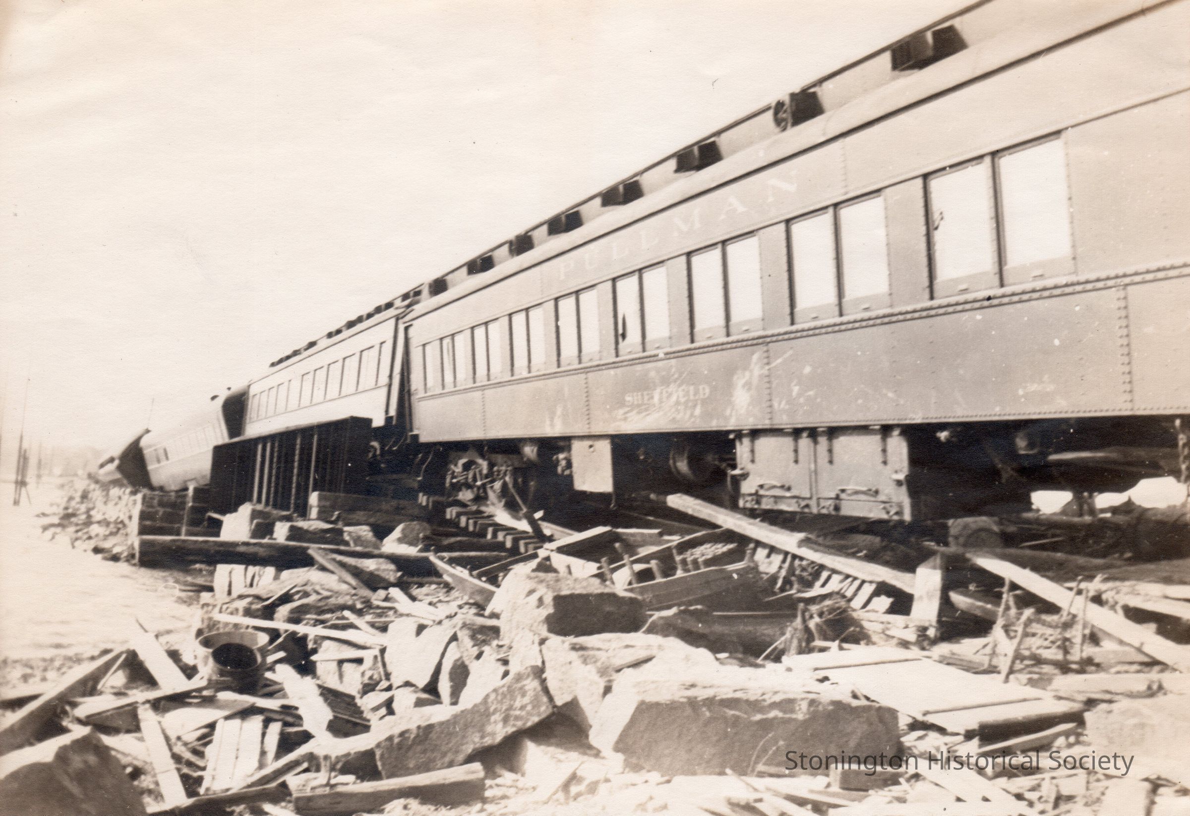 Black and white photograph and copy print, view of the train derailment caused by the 1938 hurricane. Given to the Society by Harry Northup before his death. With note: "Looking to the West at another view of the train wreck during the 1938 hurricane. Note the second car from the right sits on top of the bridge. The railroad bridge is just to the west of the Stonington Yacht Club property. You can just make out the mast of the dragger RUTH sticking up from the top left corner of the fourth passenger car. What a tangled mess of boards, planks, dislodged stones, etc., is seen in the foreground."Collection