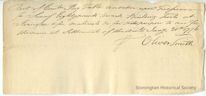 Receipt signed by Oliver Smith "for the Sum of Eighty pounds toward Building Forts at Stonington & for materials & for that purpose..."Collection