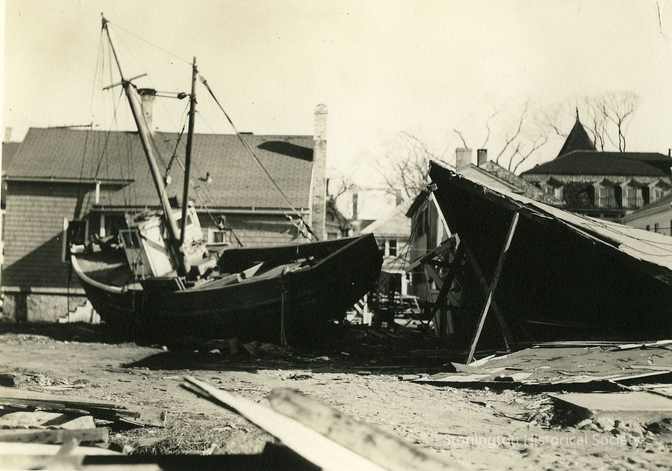 Fishing boats washed ashore in front of houses possibly near Water Street