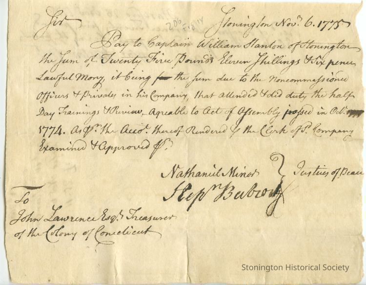 Order to John Lawrence, Treasurer of the Colony of Connecticut to "Pay Captain William Stanton ... the sum of Twenty Five Pounds Eleven Shillings & Six pence ... the sum due to the noncommissioned officers & privates in his Company that attended & did duty the half Day Training & Review, agreeable to Act of Assembly ... in Oct. 1774..."
